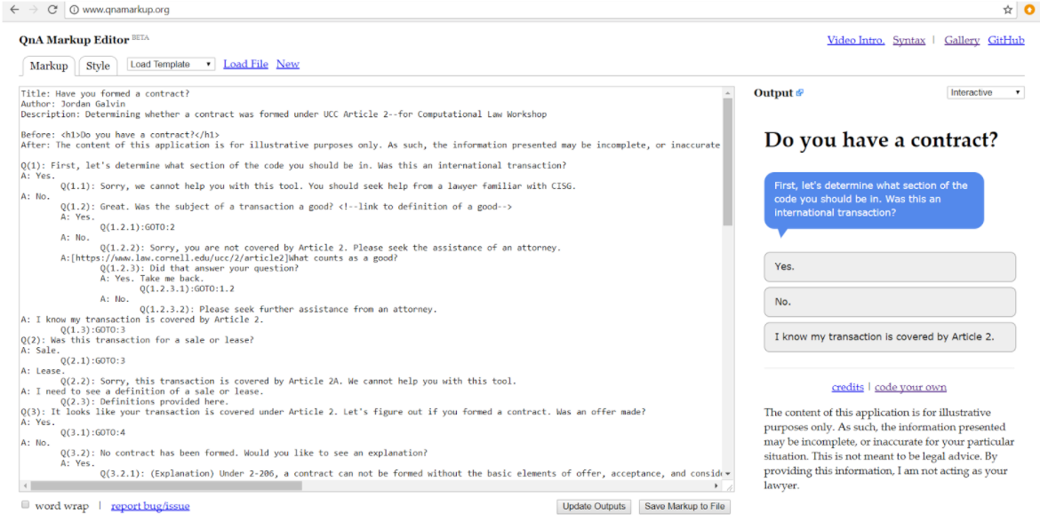 As the final component to the lecture portion of the workshop, I discussed the differences between Neota Logic, ThinkSmart, and QnA Markup. Created by David Colarusso, Director of Suffolk LIT Lab, QnA Markup is an open-source platform that can be used for simple document construction and building rules-based question-and-answer systems. Mr. Sharer gave a great example of how Neota Logic can be used, so I focused most of my time on demonstrating use cases for QnA Markup and ThinkSmart, a workflow automation platform. To help prepare the students for the second half of the workshop, when they would build their own applications in QnA Markup, I demonstrated an application that I built that helps a user determine when a contract has been formed under UCC Article 2-206 or 2-207.