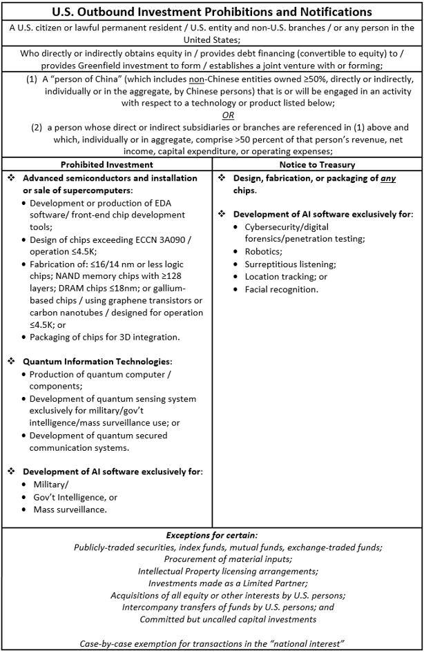 - Key takeaway #5: Third Technology-Focused Legal Regime for China: Currently, the People’s Republic of China (including Hong Kong and Macau) (hereinafter “China”) is the only “country of concern” targeted by the Executive Order. Treasury proposes to control a broad scope of activity related to the following technologies: (1) semiconductors and microelectronics, (2) quantum information technologies, and (3) artificial intelligence (AI) systems. The identified categories of technologies do not mirror those already controlled for China under existing U.S. export controls, or the clawback provisions of the CHIPS Act. Investors and other actors would need to review at least three separate technology-focused legal regimes to ensure compliance.