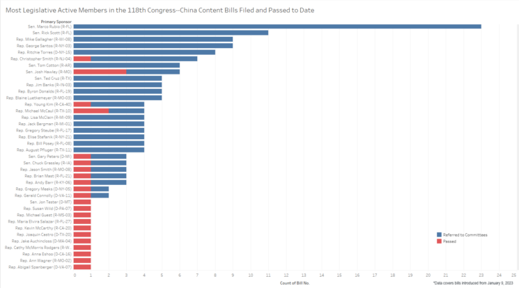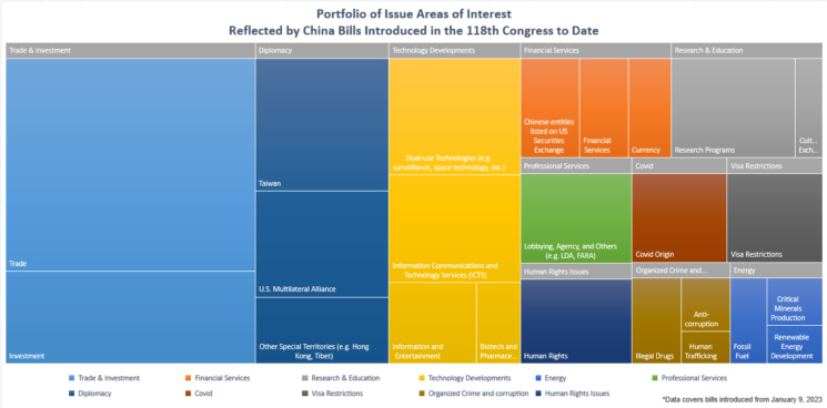 [1] A block chart below lays out those issue areas in U.S.-China policy that Congress has sought to legislate on so far in the 118th Congress. We also illustrate the most prolific legislators to date on U.S.-China policy.