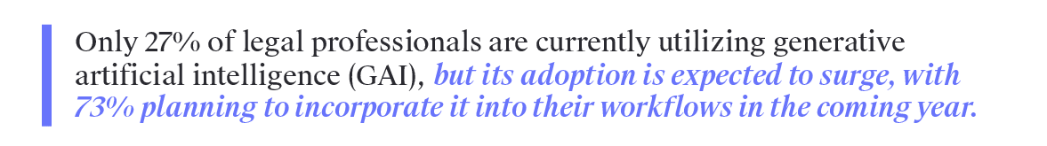 Incorporating these AI tools into your law practice is more beneficial than simply staying current with technology; it enhances efficiency, accuracy, and client service. According to our 2024 Industry Trends Report, only 27% of legal professionals are currently utilizing generative artificial intelligence (GAI), but its adoption is expected to surge, with 73% planning to incorporate it into their workflows in the coming year. As we venture further into this new era, it’s crucial to explore both the challenges and opportunities GAI presents to law firms. Let’s explore some of the top benefits AI can have in legal firms.