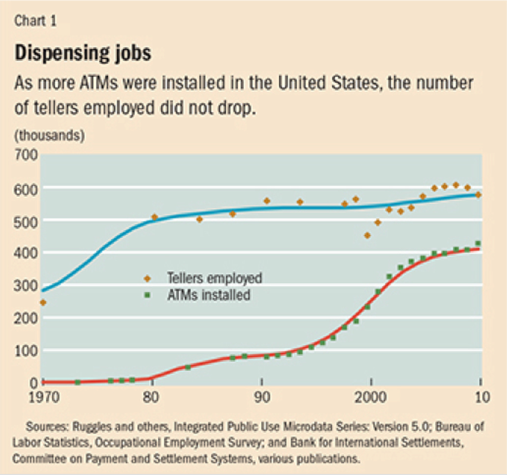 ATMs reduced the number of bank tellers necessary at each branch, from 20 to 13 between 1988 and 2004. https://www.imf.org/external/pubs/ft/fandd/2015/03/bessen.htm