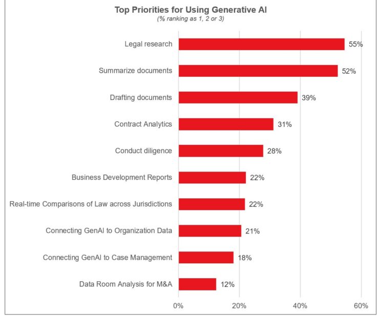 - 53% of Am Law 200 firms have purchased generative AI tools and 45% are using them for legal work