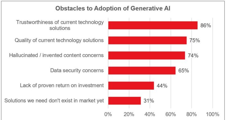 I can’t recall any prior technology that has simultaneously trigged both of breathless enthusiasm and panicked resistance . While the technology shows game changing promise, there are significant ethical, client relations, security and intellectual property concerns which still need to be addressed. The C-Suite survey charts the issues of concern where are impeding adoption of GenAI.