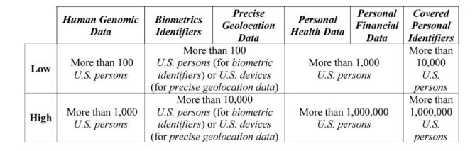 In most instances, to fall within the new rules a transaction would need to exceed certain bulk volumes defined by DOJ. While these thresholds will be refined as the rulemaking process progresses, DOJ indicates it is considering thresholds within the following ranges: