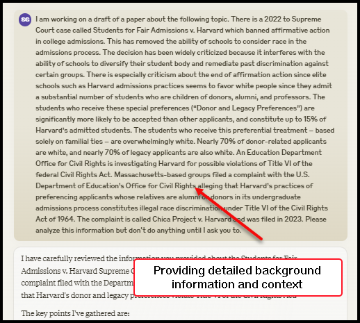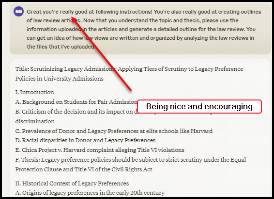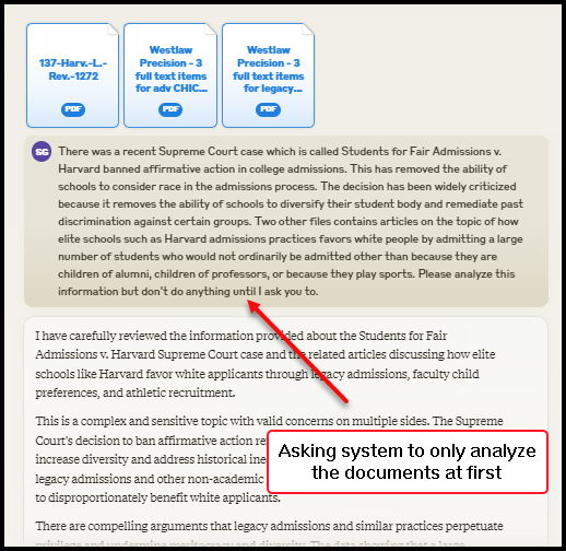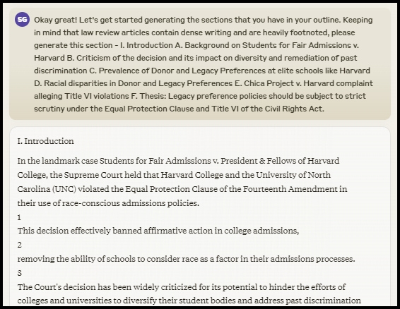 Inspired by new reports of AI-generated scientific papers flooding academic journals, I was curious to explore whether Claude could produce anything like a law review article. I randomly chose something I saw recently in the news, about how the criticism of legacy admissions at elite universities had increased in the post-Students for Fair Admissions anti-affirmative action decision era. Aware that Claude’s training data only extends up to August of 2023, and that its case law knowledge seems to clunk out in the middle of 2022, I attempted to enhance its understanding by uploading some recent law review articles discussing legacy admissions alongside the text of the Students for Fair Admissions decision. However, the combined size of these documents exceeded the upload limit, so I abandoned the attempt to include the case text.