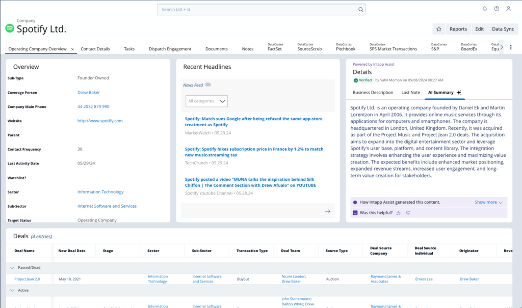 Intapp Assist’s AI-powered data summarization feature improves productivity and enhances decision-making by using AI to identify important insights within large volumes of information. These insights are presented in concise summaries that appear on deal, meeting, contact, company, and other profile pages (also known as detail pages) within Intapp DealCloud.