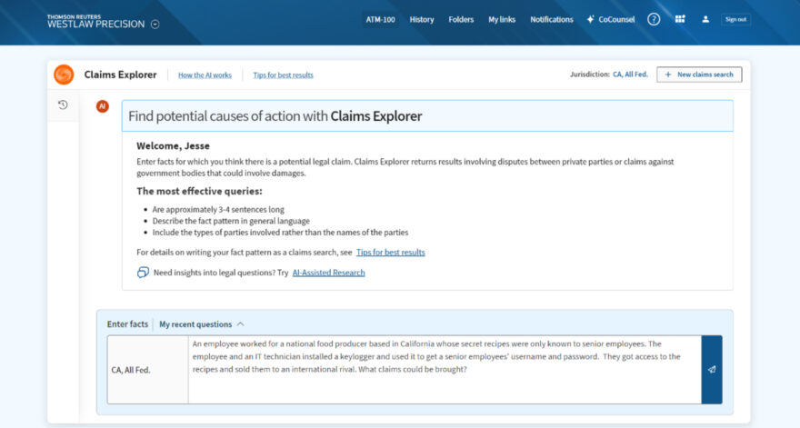 Dahn says that TR used not only AI tools but also attorney editors to develop the tool. “Claims Explorer solves significant research problems in a way that GenAI alone has trouble with…When we tried to solve claims research issues with AI alone, it didn’t work very well, so we had our attorney editors create new content about causes of action that enabled AI to work much better. “