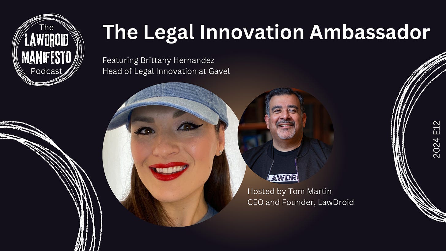 In this episode of LawDroid Manifesto, Tom Martin interviews Brittany Hernandez, head of legal innovation at Gavel. Brittany shares her fascinating journey from aspiring FBI agent to lawyer, military veteran, film school graduate, and now a leader in the legal technology industry. Throughout the conversation, Brittany emphasizes the importance of creativity, empathy, and embracing diverse life experiences to drive innovation in the legal profession.