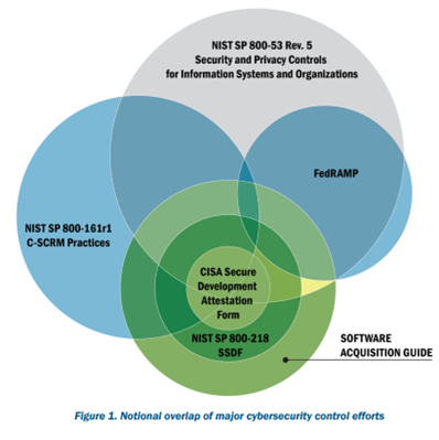 The Software Acquisition Guide is intended to be used both by government and by industry personnel and is meant to bridge gaps between other relevant security controls such as National Institutes of Standards and Technology Special Publication (“NIST SP”) 800-53 (“Security and Privacy Controls for Information Systems and Organizations”), the Federal Risk and Authorization Management Program (“FedRAMP”), and NIST SP 800-161 (“Cybersecurity Supply Chain Risk Management Practices for Systems and Organizations”). The Software Acquisition Guide contains an illustration that indicates how these regimes overlap with each other: