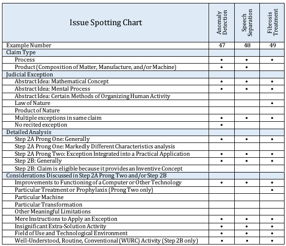 With the 2024 AI SME Update, the Office drafts hypothetical and illustrative examples showing the claim analysis performed under MPEP § 2106. The 2024 AI SME Update also provides a helpful Issue Spotting Chart that is reproduced below for reference: