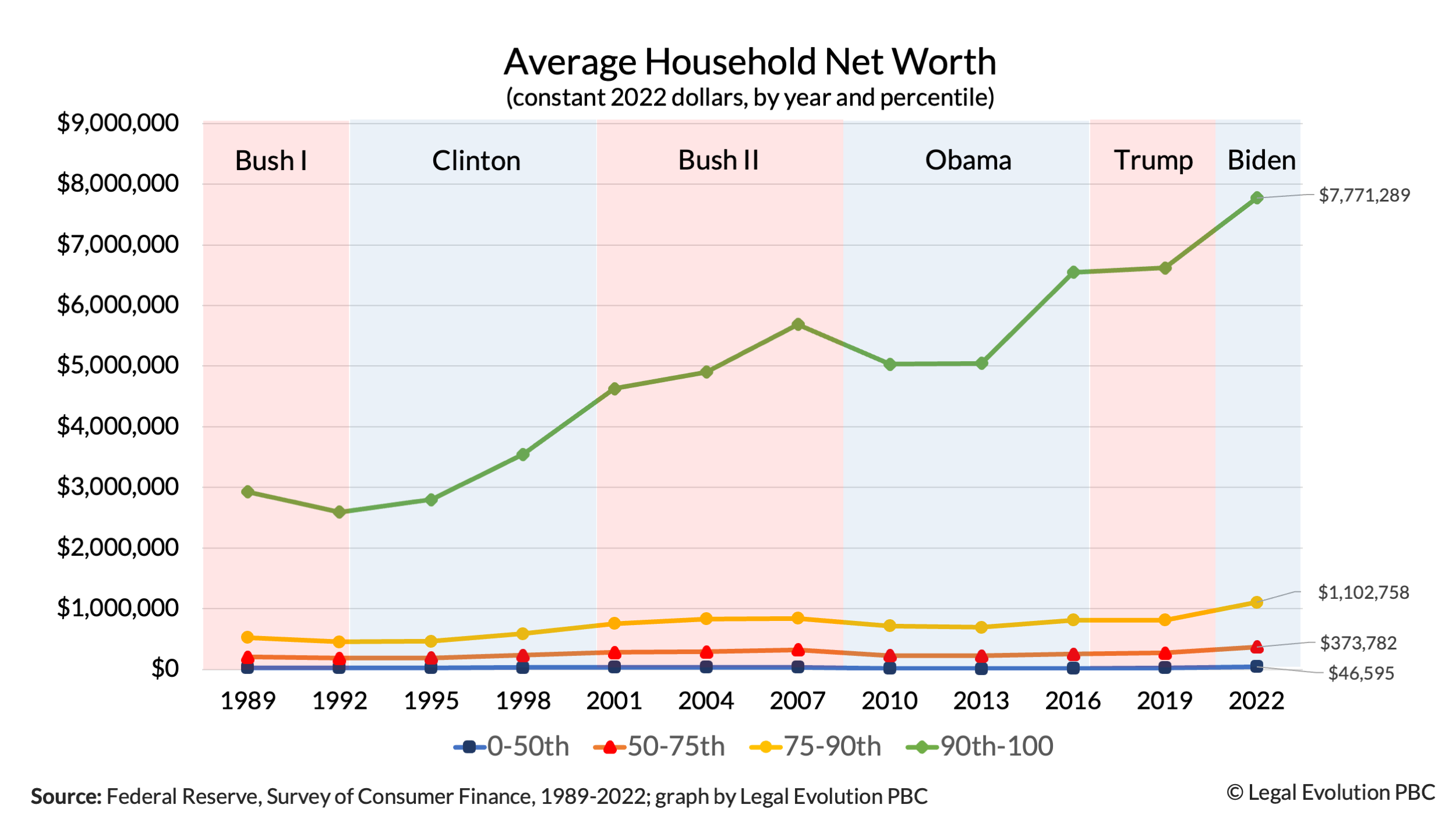 Over the last 35 years, the average net worth of households in the bottom 50% has never exceeded $50,000 (measured in constant 2022 dollars). Yet, except for Bush I, who lost his job over a tax increase on the wealthy, Republican and Democratic administrations have consistently delivered million-dollar gains for the top 10%. Focusing just on the Biden portion of the graph, we can be certain that federal pandemic policies—massive fiscal stimulus plus the Federal Reserve’s printing of money—triggered significant inflation. Of course, this angered voters. However, there is little public awareness that these policies also increased the value of household wealth, such as stocks and real estate. See, e.g., Sean Ross, “How Quantitative Easing (QE) Affects the Stock Market,” Investopedia, Aug 28, 2023.