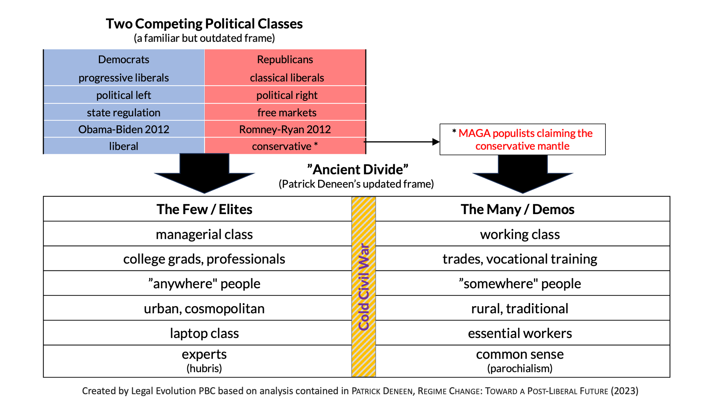 The blue and red box at the top of Chart 4 characterizes this divide, albeit Deneen believes that many voters view both sides as corrupt and compromised elites. Thus, nothing reliably resonates, whether it’s Harris, Biden, Sanders, or Warren from the left or Cheney, Haley, Romney, or Ryan from the right. Drawing upon political theory going back to Aristotle and Plutarch, Deneen’s deeper claim is that “the dual embrace of economic and social ‘progress’ has generated a particularly virulent form of that ancient divide that pits ‘the few’ against ‘the many.’” Regime Change at x.