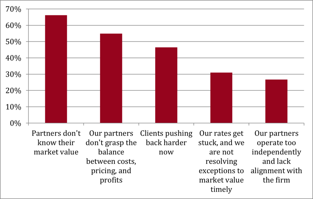 The top reported challenge is that many partners lack a clear understanding of their market value, which is driven by several factors. These include limited transparency in the pricing landscape, a focus on practicing law rather than monitoring competitors’ rates, and an undervaluation of their market position. Moreover, the legal services market is inefficient, with wide rate discrepancies among comparable firms.