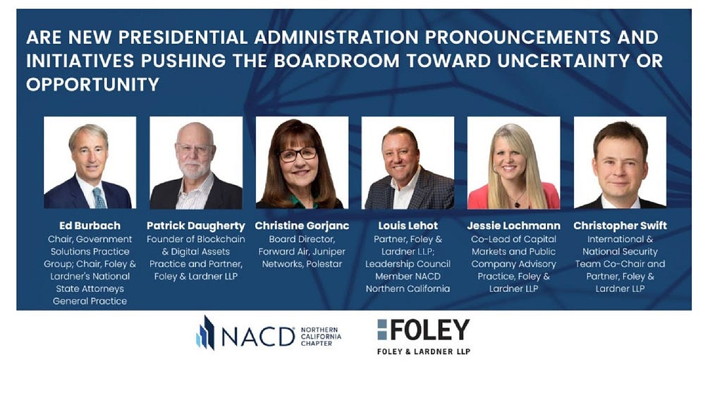 Foley & Lardner LLP recently co-hosted a webinar with the National Association of Corporate Directors (NACD) to discuss how a new presidential administration and evolving state-driven regulations are effecting boardrooms. A summary of that discussion can be found below.