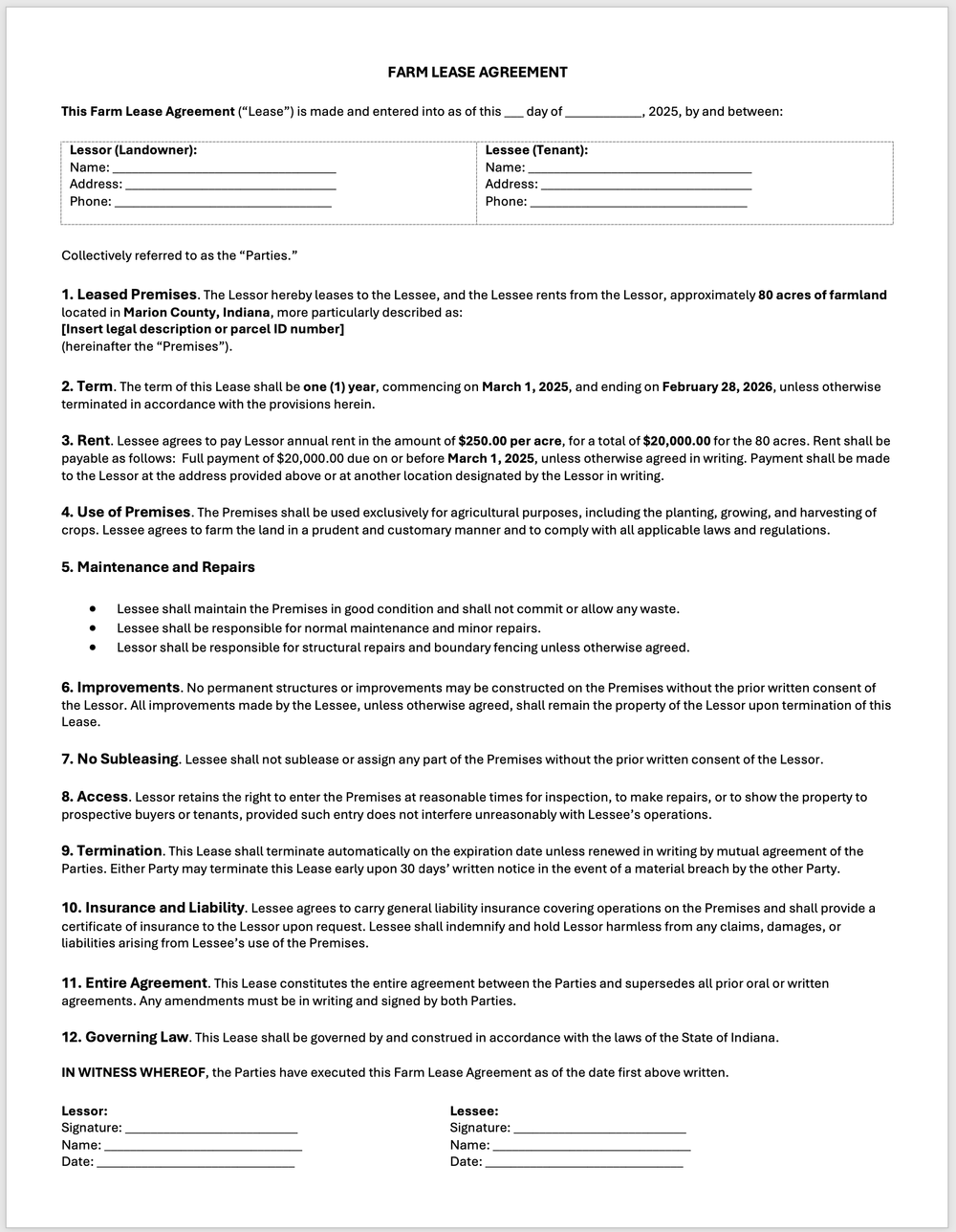 Here is an example in agricultural law. I recently asked Chat GPT: “Draft a lease for 80 acres of farmland in Marion County, Indiana at $250/acre for 1 year.”