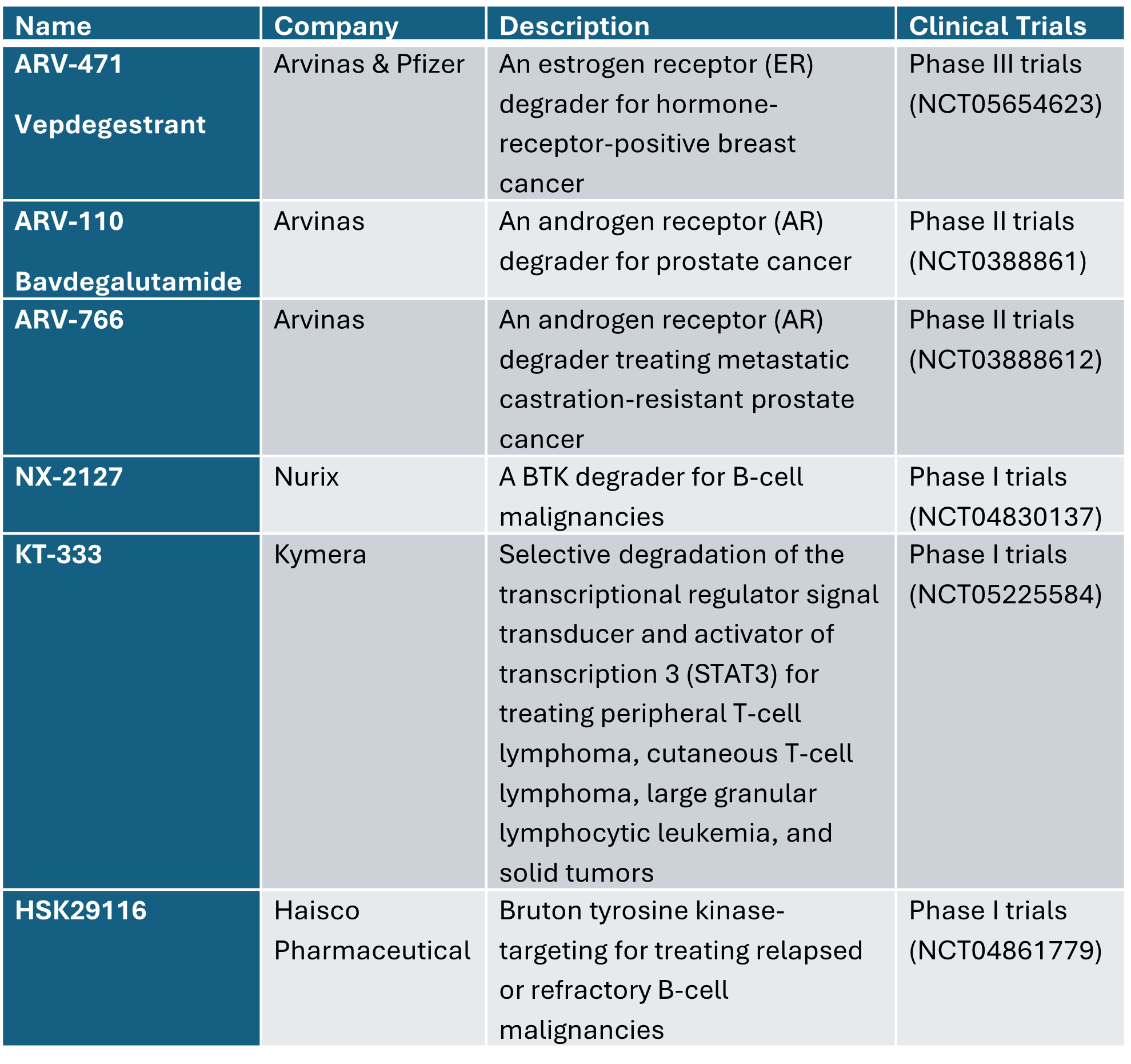 There are multiple types of protein degraders, including (1) proteolysis-targeting chimeras (PROTACs); (2) molecular glues; (3) lysosome-targeting chimeras (LYTACs); (4) autophagy-targeting chimeras (AUTACs); and (5) autophagosome-tethering compounds (ATTECs). PROTACs and molecular glues are the most prevalent types, and have advanced the furthest in clinical trials.