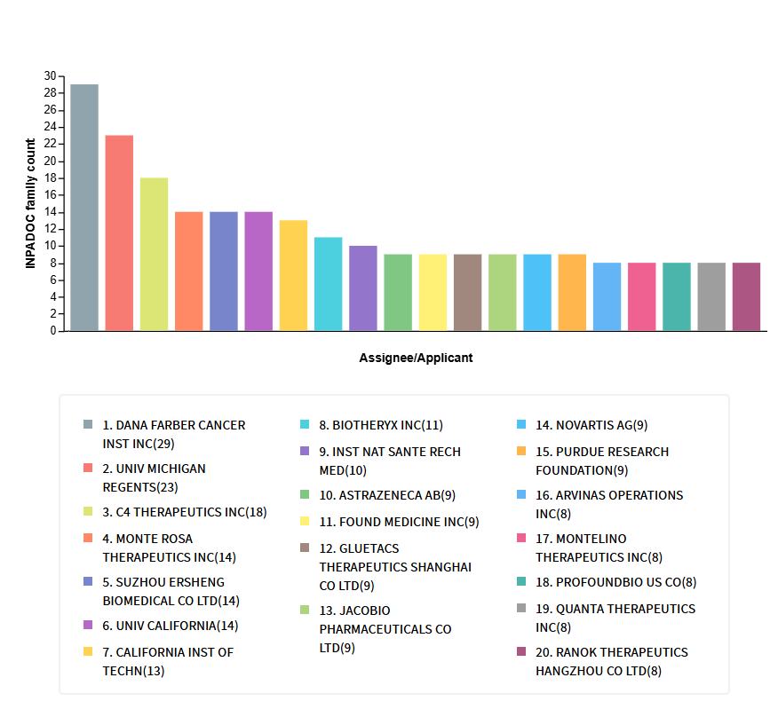 Indeed, a patent landscape analysis from January 2013 to July 2023 identified close to 622 INPADOC patent families relevant to PROTACs and bifunctional degraders from myriad assignees, highlighting the active IP management in this space.[39]