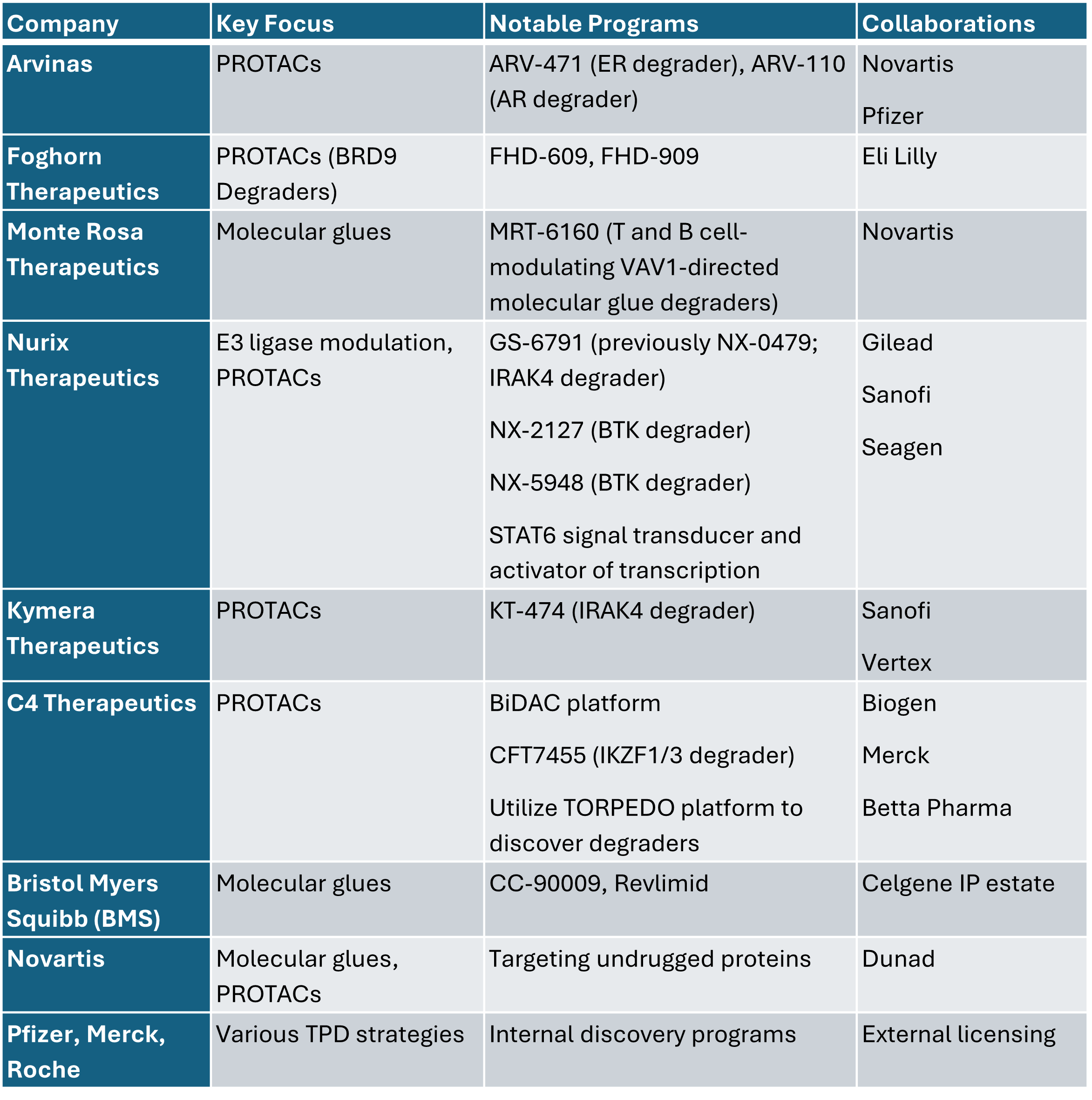 Several biotechnology and pharmaceutical companies are actively pursuing TPD therapies. The competitive landscape includes both dedicated TPD companies and large pharmaceutical firms incorporating degraders into their pipelines.