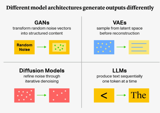 Generative Adversarial Networks (GANs) transform random noise vectors into structured output through a generator trained against a discriminator that evaluates output quality. Variational Autoencoders (VAEs) sample from the latent space coded in model parameters before reconstruction using learned data patterns. Diffusion Models refine random noise through iterative denoising, typically requiring up to 1,000 separate steps to create coherent output. Lastly, Large Language Models (LLMs) produce text sequentially one token at a time based on learned patterns and probabilistic predictions of what should come next.