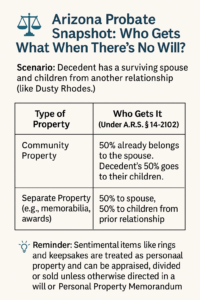 And here’s the key Arizona twist: if a married person dies without a will and has children from another relationship (as Dusty did), Arizona’s intestate succession laws (A.R.S. § 14-2102) require that half of the separate property go to the children, and the other half to the surviving spouse. So Michelle may have had a legal right to some of Dusty’s memorabilia—but not necessarily all of it.