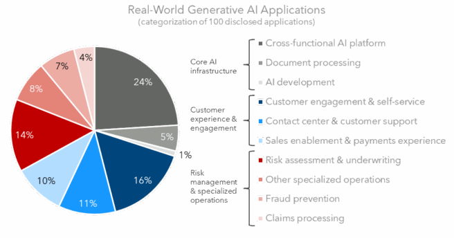 Generative artificial intelligence (AI) is reshaping the financial services sector, moving from pilot projects into scaled enterprise adoption. CB Insights’ latest report addresses 100 actual applications of generative Al in financial services and insurance (the “Report”). According to the Report, banks, insurers, and wealth managers are deploying large language models (LLMs) in order to improve efficiency, personalize client interactions, and enhance risk management.