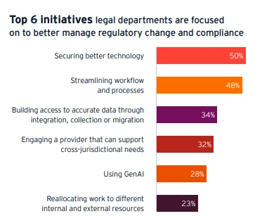 Research from EY’s 2025 General Counsel Study shows a similar pattern. Legal departments rank securing technology (50%) and streamlining workflows (48%) above GenAI adoption (28%), highlighting that governance and reliable systems remain the first priority. The findings reinforce the idea that AI works best when built on strong foundations of technology, process, and data.