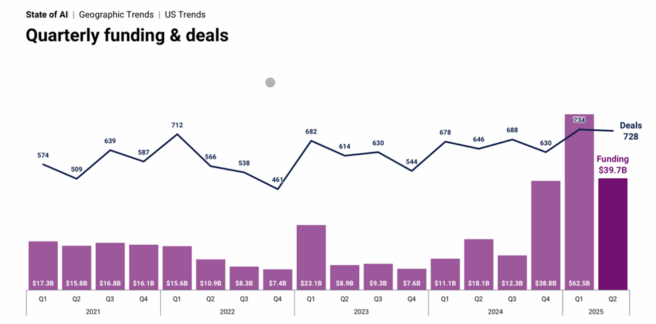 Funding for artificial intelligence (AI) companies totaled $47.3 billion globally in Q2 2025, the second-highest quarter on record and the third straight quarter above $40 billion according to CB Insights’ report The State of AI (Q2 2025). Total first half 2025 funding outpaced 2024 funding, raising $116.1 billion versus 2024’s $104.7 billion. Deal volume reached 1,403, up 2.5% from the first quarter, bringing the total number of AI deals in 2025 to 2,772. Deals in the US dominated activity, capturing $39.7 billion, or approximately 84% of global funding, in 728 deals.