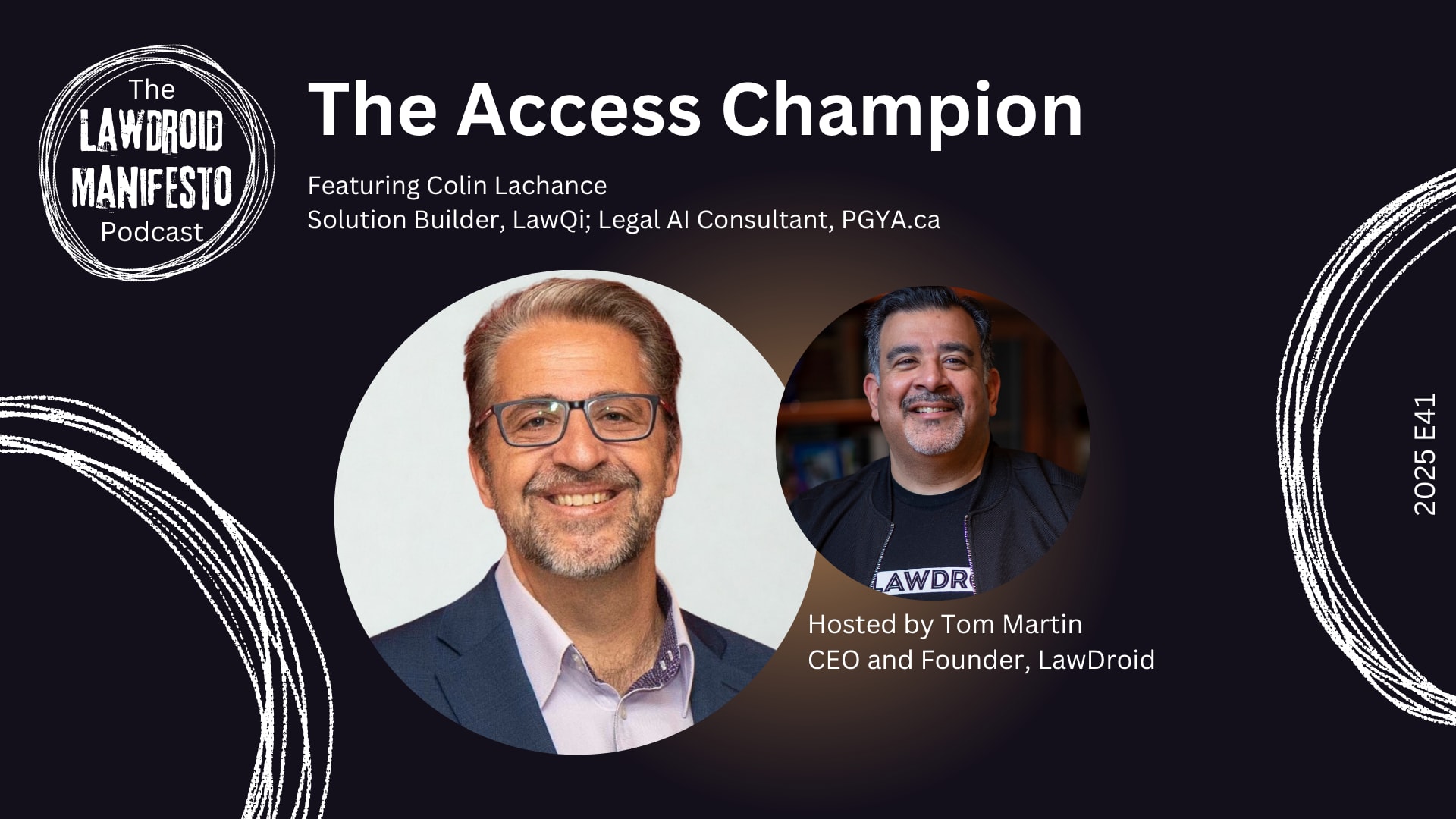 I’ve known Colin Lachance for years and he’s always been one of those people that I just vibe with. It may be because we are Gen X and get the same cultural references. It may be because we’re both kinda nerdy and love tech. It may be because we share the same values about access to the law for everyday people. Or, it’s likely all of those things combined. I’ve dubbed Colin, “The Access Champion” because that’s who he is. I hope you enjoy our conversation as much as I did.