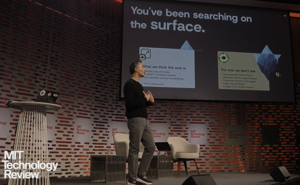 Browsing, he argued, is a task humans intuitively master but one that AI finds challenging. “The internet has gotten too big, too massive for humans to do anything with it anymore. We have to revive the internet… we are only seeing 10% off the internet today.” Google indexes less than 10%; systems like ChatGPT see even less, which leaves vast amounts of data, the so-called “deep web”, untapped by current agent technology.