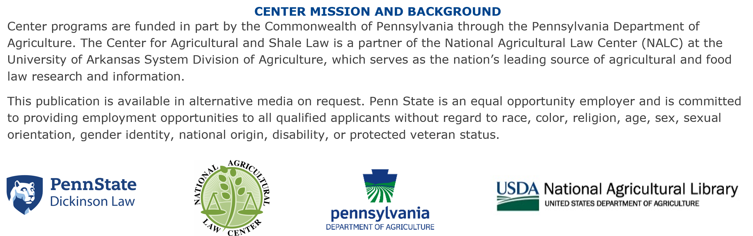 AgWorks: Connecting Agricultural Businesses to Workforce Services and Training. From 2025 to 2027, the Penn State Center for Agricultural and Shale Law and Penn State Extension will collaborate with farms and agriculture-related businesses to strengthen the workforce system. AgWorks will provide 100 registered small- to medium-sized Pennsylvania farms and agribusinesses with no-cost training and consultation to ensure business sustainability. As part of the AgWorks program, the Center for Agricultural and Shale Law will provide legal consulting and present 20+ employment law programs.