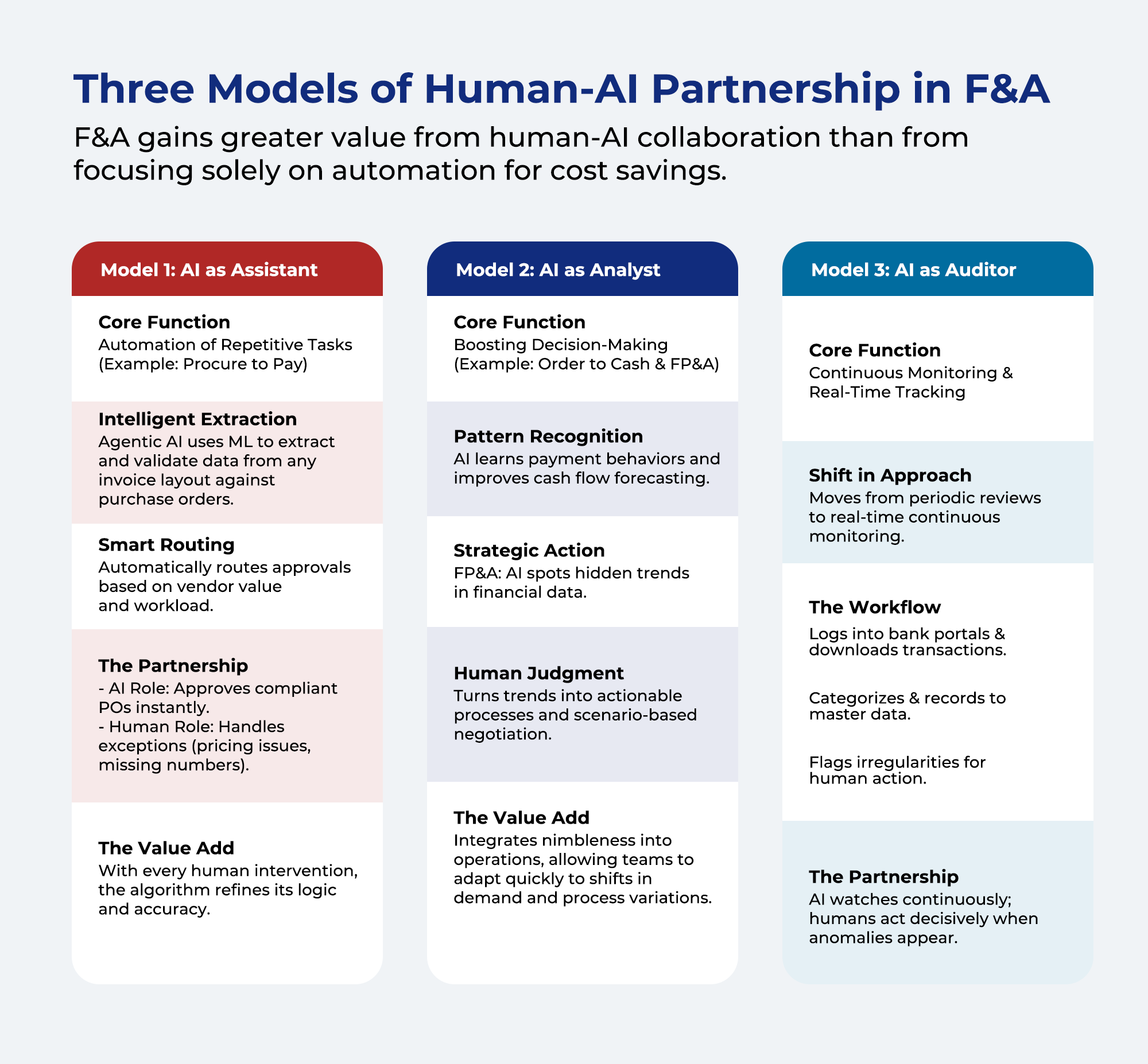 F&A gains greater value from human-AI collaboration than from focusing solely on automation for cost savings. Below are three models of collaboration that define what an AI-human partnership looks like in practice.