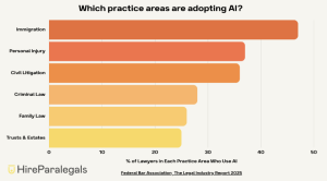 When evaluating AI use by practice area, immigration law is leading the way, with almost half (47%) of all firms surveyed having already adopted AI tools, followed by personal injury (37%) and civil litigation (36%).