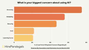 However, attorneys also report major concerns regarding the adoption of AI tools into law practices. Over two-thirds of respondents identified lack of accuracy as a major risk when implementing AI, followed by reliability (56.3%), data privacy and security (47.2%), costs of implementation (22.1%), and time to learn new technologies (21.3%).