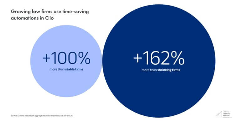 Many firms now automate at least some tasks. And the firms automating strategically are outgrowing their competition. The 2025 Legal Trends Report found that growing law firms, firms whose revenue grew at least 20% over a five-year period, use time-saving automations in Clio twice as much as stable firms, and three times more than shrinking firms.