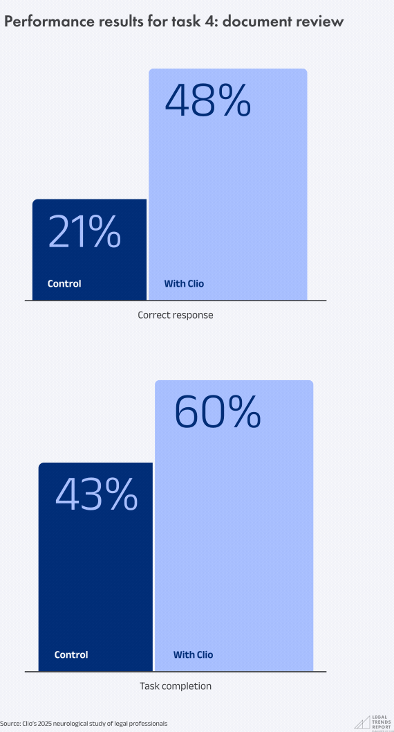 The fact that researchers saw such a drop in active focus while using Clio means that participants significantly reduced mental load in this area of brain activity. This allowed them to complete a routine task with less effort, conserving mental energy for more demanding legal work.