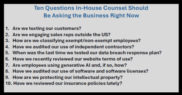 I want to go back to the basics of being an in-house lawyer.  For me, that means being attuned to what is going on at the company and asking lots of questions.  Questions are often the most important tool in your in-house survival kit.  The right questions at the right time can reveal problems that can get solved before they become big problems. Nipping things in the bud is an undervalued skill most in-house lawyers bring to the table.  I think it’s undervalued because many legal departments don’t know how to market why their early intervention is so valuable to the business.  You can find out more about how to solve that problem by reading my post on how to market the legal department.[2]  Besides marketing skills, in-house lawyers need to spend time thinking about what types of problems may be lurking out there that can cost a lot of blood and treasure to fix.  In other words, what questions should I be asking the business here in January 2026?  This is the difference between legal being the brake pedal (reactive) vs. the gas pedal (proactive).  You want to be the latter!  I have been thinking about this over the past several weeks and have come up with a list of questions that I think all in-house lawyers should be asking the business right now.  This edition of “Ten Things” sets those questions out for you, along with why they matter (to legal and to the business) and, more importantly, potential next steps: