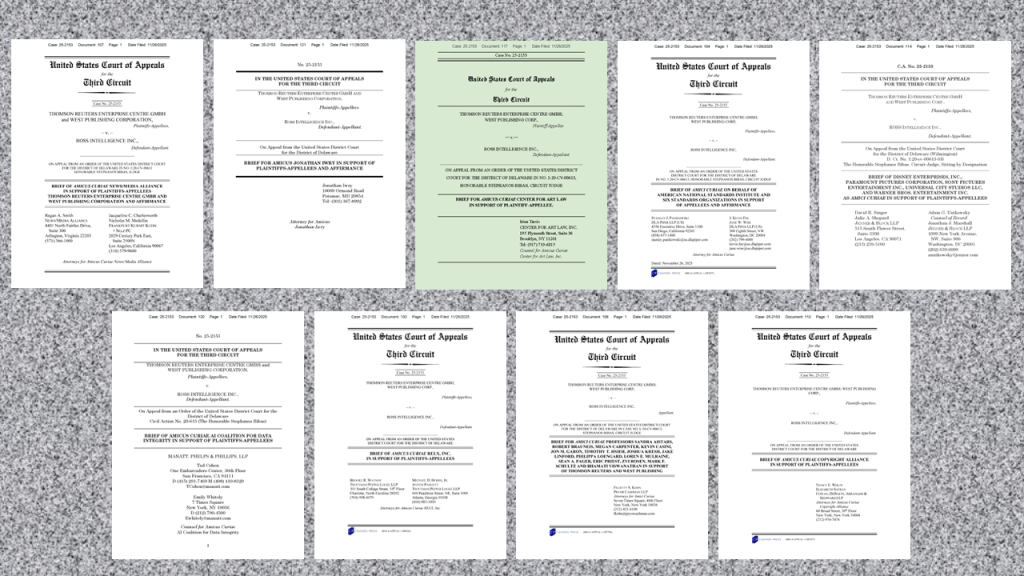 Film Studios, News Media and Even Competitor LexisNexis Among the 12 Amicus Briefs Supporting Thomson Reuters’ Copyright Case Against ROSS